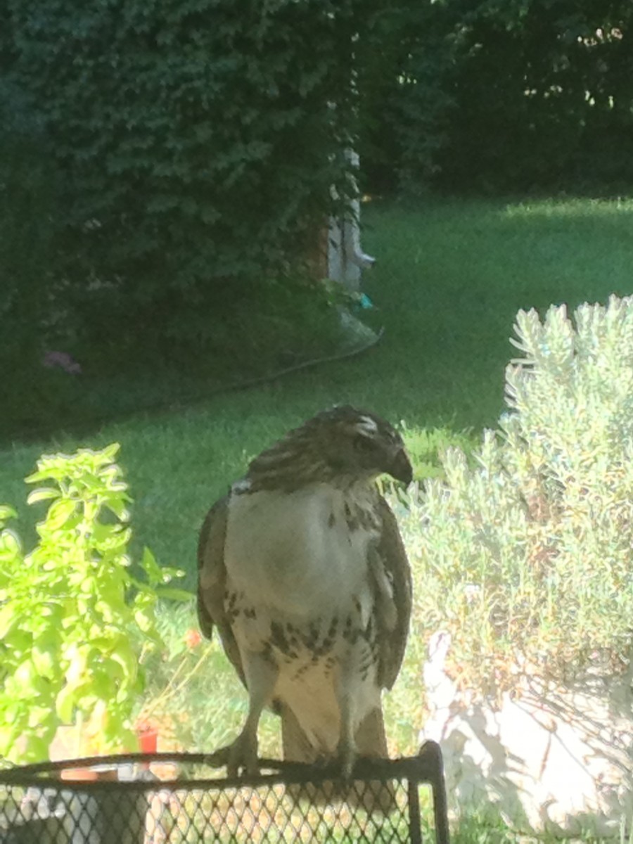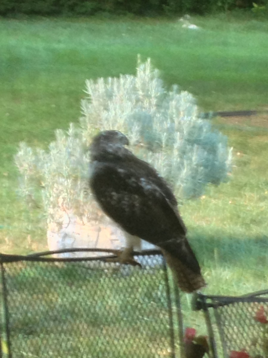 This hawk came to visit us last year, perched on a chair on our porch, and partially consumed a rabbit, part of which he very generously left for us. We didn’t eat it LOL. Amazingly, the hawk turned his back on us and just hung out with us for a while.